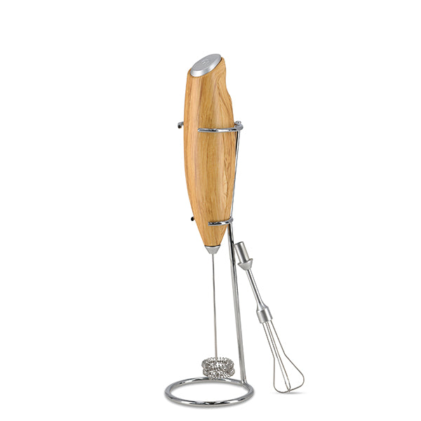 תיאור מקציף חלב חשמלי בעיצוב עץ כולל 2 ראשים ומעמד
